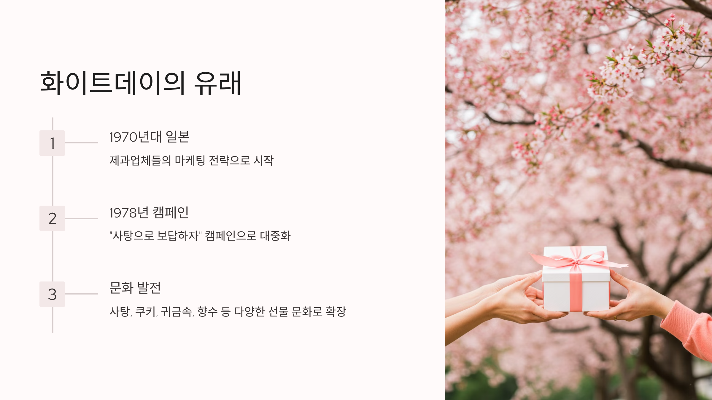 화이트데이의 기원은 1970년대 일본으로 거슬러 올라갑니다. 일본의 제과업체들이 마케팅 전략으로 ‘남성이 여성에게 답례 선물을 하는 날’을 만들었고, 특히 1978년 한 제과업체가 "사탕으로 보답하자"라는 캠페인을 진행하며 화이트데이가 대중화되었습니다. 이후 초콜릿뿐만 아니라 사탕, 쿠키, 귀금속, 향수 등 다양한 선물을 주고받는 문화로 발전했습니다.
