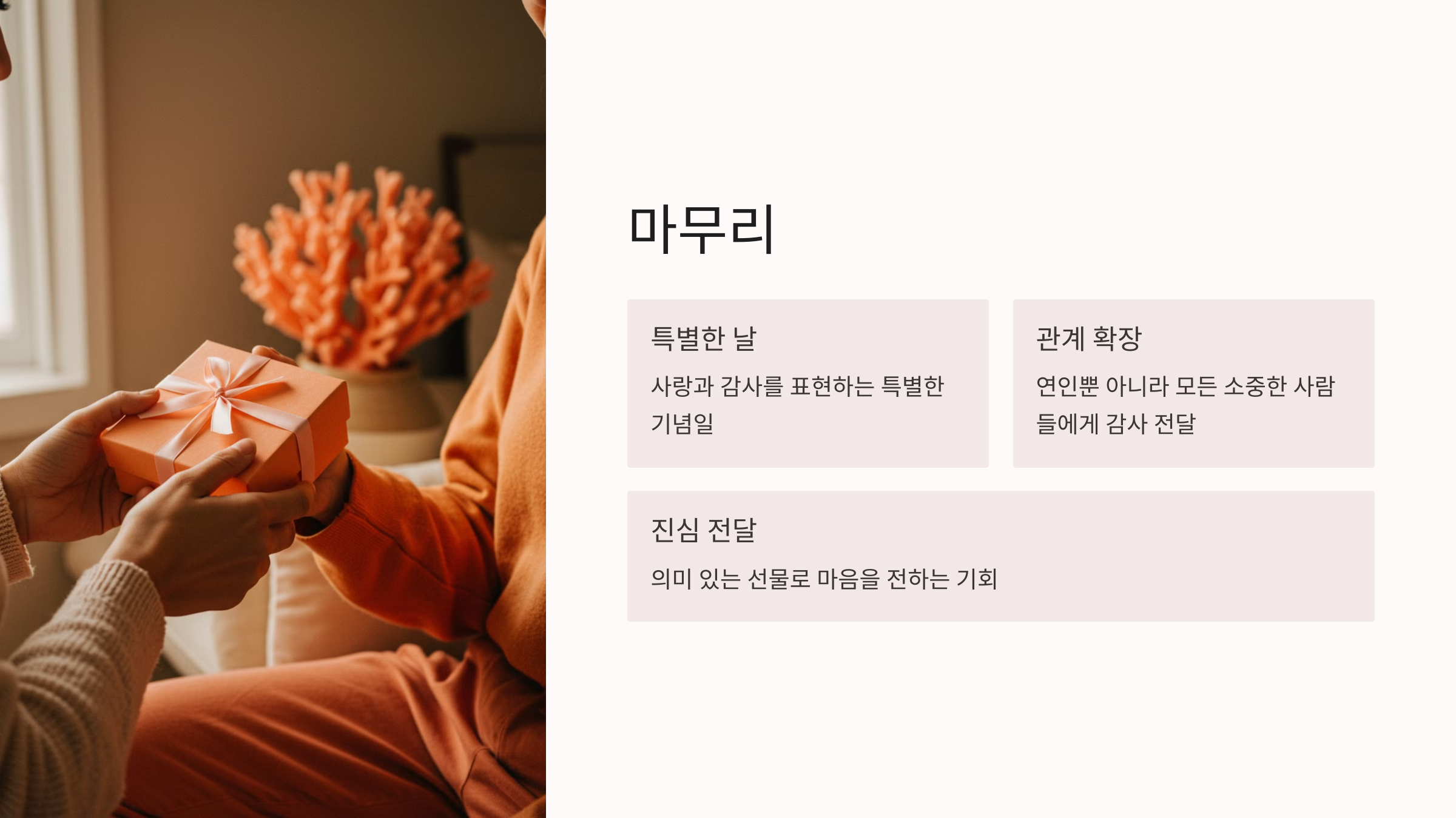 화이트데이는 단순한 기념일을 넘어 사랑과 감사를 표현하는 특별한 날입니다. 꼭 연인이 아니더라도 가족, 친구, 동료에게 감사를 전하는 기회로 삼을 수 있습니다. 올해 화이트데이에는 의미 있는 선물을 준비해 소중한 사람에게 마음을 전해보세요.
